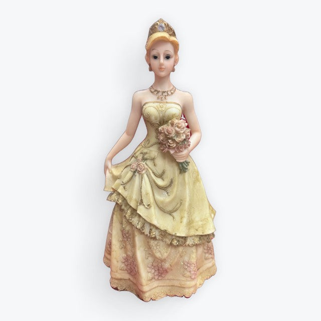 Exuding elegance and grace, this gold-colored figurine depicts a young lady in a flowing ball gown, crowned like royalty. The delicate details of her gown, the...