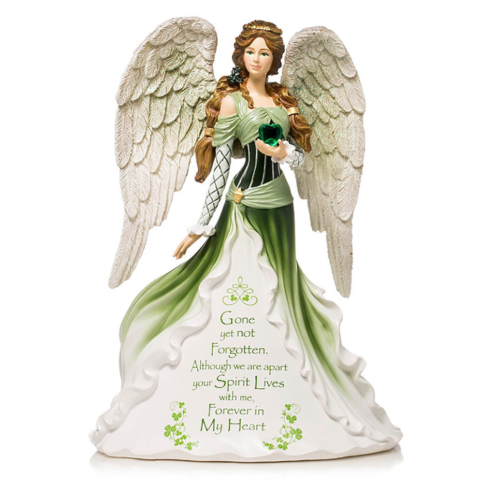 Each of the handcrafted Irish angel figurines in this collection is inspired by the luminous artistry of Thomas Kinkade and handcrafted in stunning detail. From the \"etched\" feathers of their glittery wings to the ornate details accenting their Celtic-inspired dresses, these beautiful figurines are painted by hand! Dazzling faux gems shine as bright as the love you\'ll carry in your heart forever. A heartwarming sentiment commemorating your loved one is elegantly inscribed on the front of each Irish angel\'s dress.