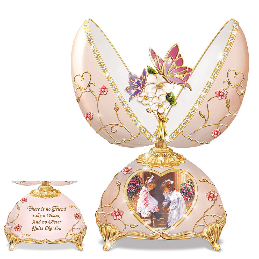 Meticulously handcrafted from lustrous Heirloom Porcelain®, this musical treasure gleams with genuine 22K-gold accents and sparkles with 98 faux jewels, hand set in the esteemed Peter Carl Faberge artisan tradition. The hand-glazed, iridescent pink shell and base are adorned with raised-relief vines, blossoms and hearts, and the egg opens to reveal two spectacular, hand-enameled metal butterflies upon sculpted white flowers - symbolizing you and your sister. The front of the elegant base features a darling portrait of two sisters by Sandra Kuck, embraced by a hand-painted, 22K-gold border, while the back is graced with a loving sentiment in 22K-gold lettering, \"There is no Friend Like a Sister, And no Sister Quite like You\". Plus, this porcelain music box plays the melody of \"Always in My Heart\" for a sweet finishing touch.