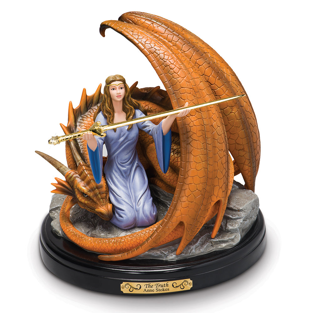 A fan of myth and magic ever since her father read her stories as a child, acclaimed artist Anne Stokes is blessed with world-class talent that has propelled her to the top of the international fantasy art genre. Now, enter the world of her spell-binding imagination with this dragon sculpture, a first-ever fully dimensional interpretation of her visionary painting \"The Truth\". Introducing the Anne Stokes\'s The Truth Sculpture, a limited-edition International Collectibles Market First, available exclusively from The Bradford Exchange. This masterpiece sculpture is sure to make a treasured personal keepsake and an enchanting fantasy gift for a devoted follower of this genre.
