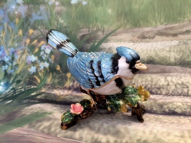Blue Jay Bird Enamelled Treasures Trinket Box with Necklace