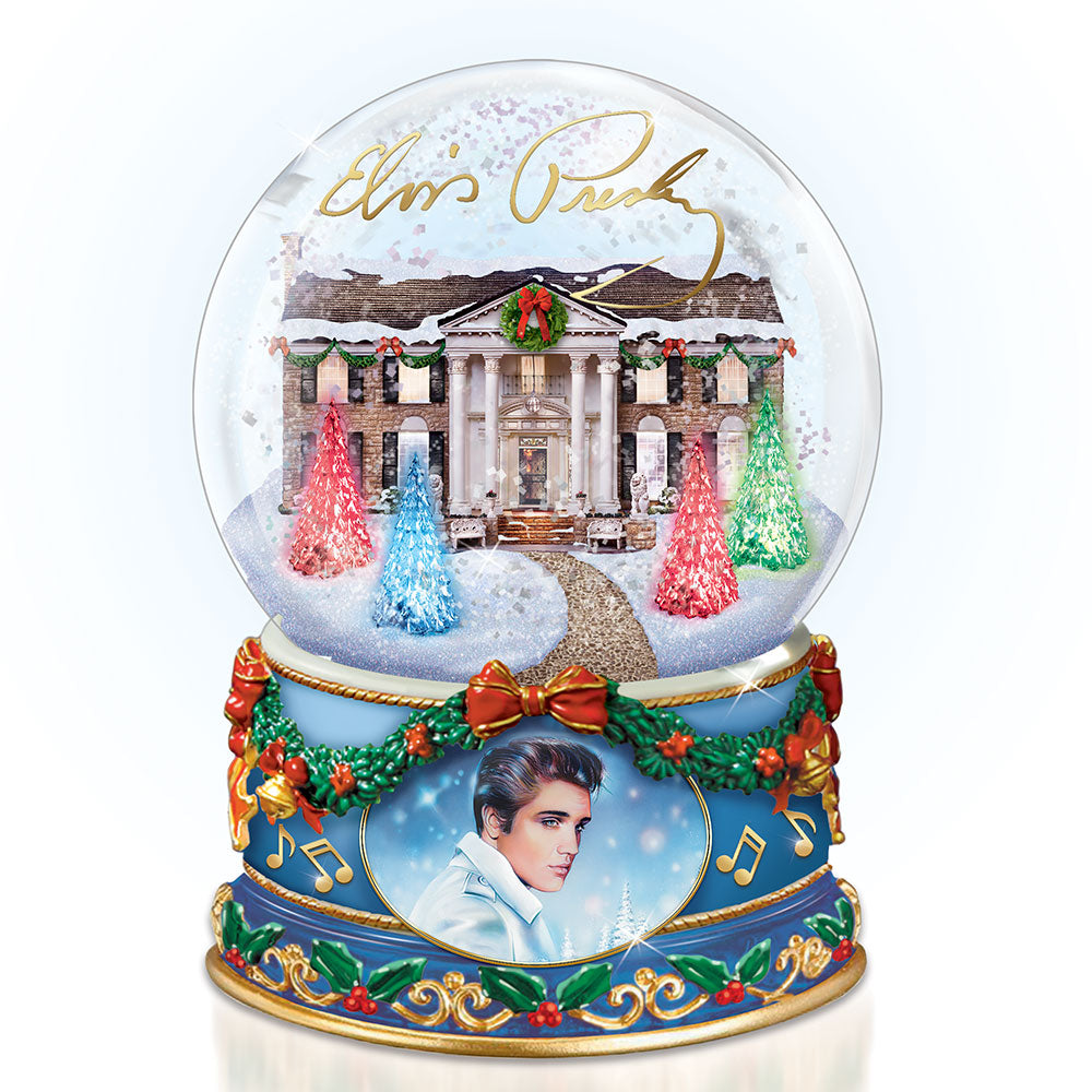 Share the joy of Elvis’s own winter wonderland with the new Merry Christmas from Graceland Illuminated Musical Glitter Globe from The Bradford Exchange. Featuring an amazingly detailed sculpture of Elvis’s beloved home, this festive, musical wonder is a celebration all by itself!