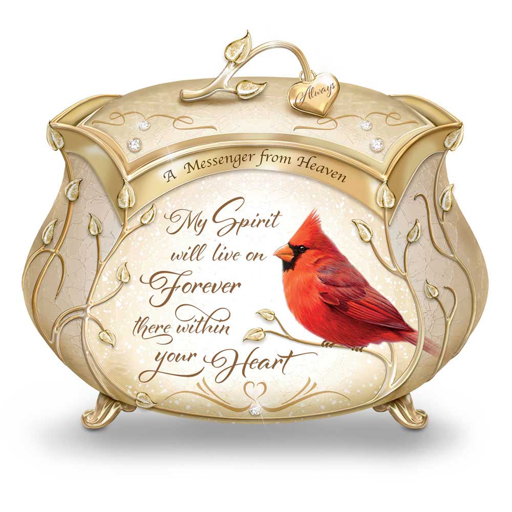 When we lose a loved one, we cherish the gentle reminders of what they have meant to us. The sight of a brilliant cardinal on a nearby branch, the sound of leaves rustling in the wind...these constant gifts of nature can reassure us and give us comfort in knowing that our loved one’s spirit lives on. Now, remember a loved one with the A Messenger From Heaven Music Box, available exclusively from The Bradford Exchange.