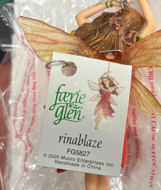 "Faerie Glen fairy Rinablaze" refers to a specific fairy figurine produced by Faerie Glen, a company that creates fairy figurines.