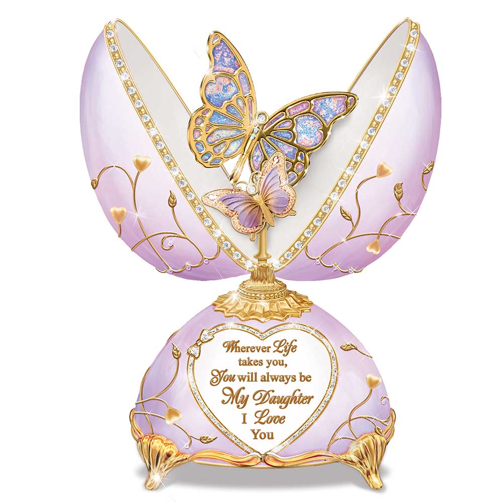 Handcrafted of precious Heirloom Porcelain®, this musical egg displays spectacular hand-enameled butterflies that symbolize a mother and daughter. Elegant vines sprawl across a beautifully hand-glazed lavender shell. On the base, a heart-shaped inset displays the loving message, \"Wherever Life takes you, You will always be My Daughter I Love You\". It plays the sweet melody of \"You Are So Beautiful\" and arrives with a touching poem card as the perfect finishing touch. A precious symbol of a mother\'s love, this stunning music box is sure to be a birthday, holiday, or graduation gift that your daughter will always cherish.