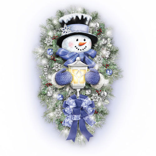Whether it's a festively-decorated snowman, the radiance of Thomas Kinkade's beloved artistry or festive greenery touched with snow, there are many sights that call to mind the warmest memories of winter. Now, you can bring these beloved hallmarks of seasonal cheer home with the Thomas Kinkade A Warm Winter Welcome Wreath. Grandly sized and brightly illuminated, this holiday snowman wreath is a first ever exclusively from The Bradford Exchange. Handcrafted with the look of fresh-cut pine, it is lavishly decorated with silvery, glittery round ornaments, silvery snowflake designs and lifelike holly leaves and crimson berry clusters - with a dapper, hand-painted snowman sculpture at the center!An impressive two feet high, this Always in Bloom® teardrop-shaped wreath is truly magnificent. The merry snowman is bundled up in a real fabric scarf, festive blue bow, snow-glittered top hat and bright blue "knit" mittens. Plus, he holds a handcrafted lantern - inspired by the distinctive lampposts in Thomas Kinkade's beloved art - that lights up with golden radiance. Flip the switch to see more sparkling white lights add a warm holiday glow to the lush evergreen boughs. For added convenience, a built-in timer turns the lights on and off at the same time each night.Measures 24" H; 61 cm H Recommended for indoor use. ©2017 Thomas Kinkade. ©2017 The Bradford Exchange